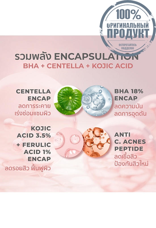 • BHA 18% Encapsulation: Controls oil production, prevents breakouts, and provides sustained release for up to 7 hours, without drying or irritating the skin.